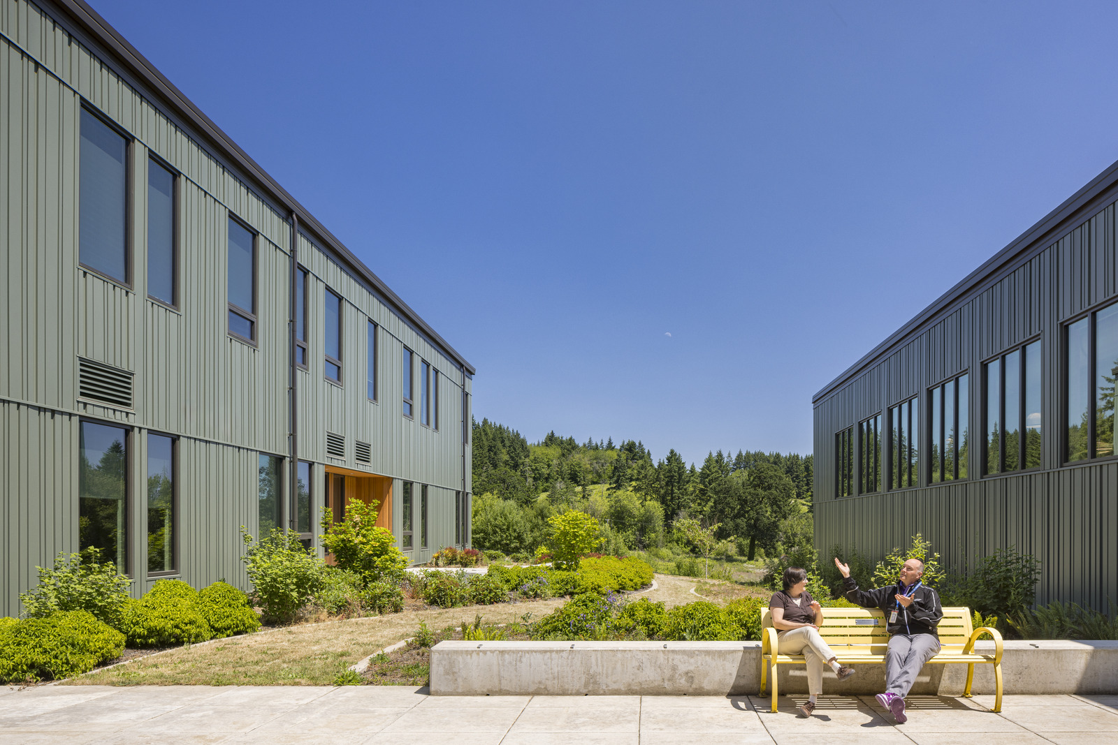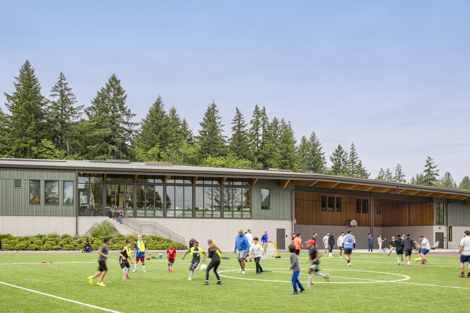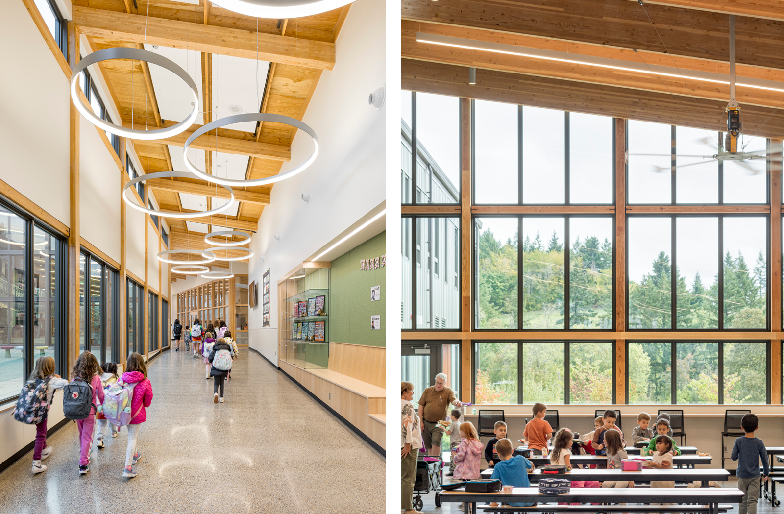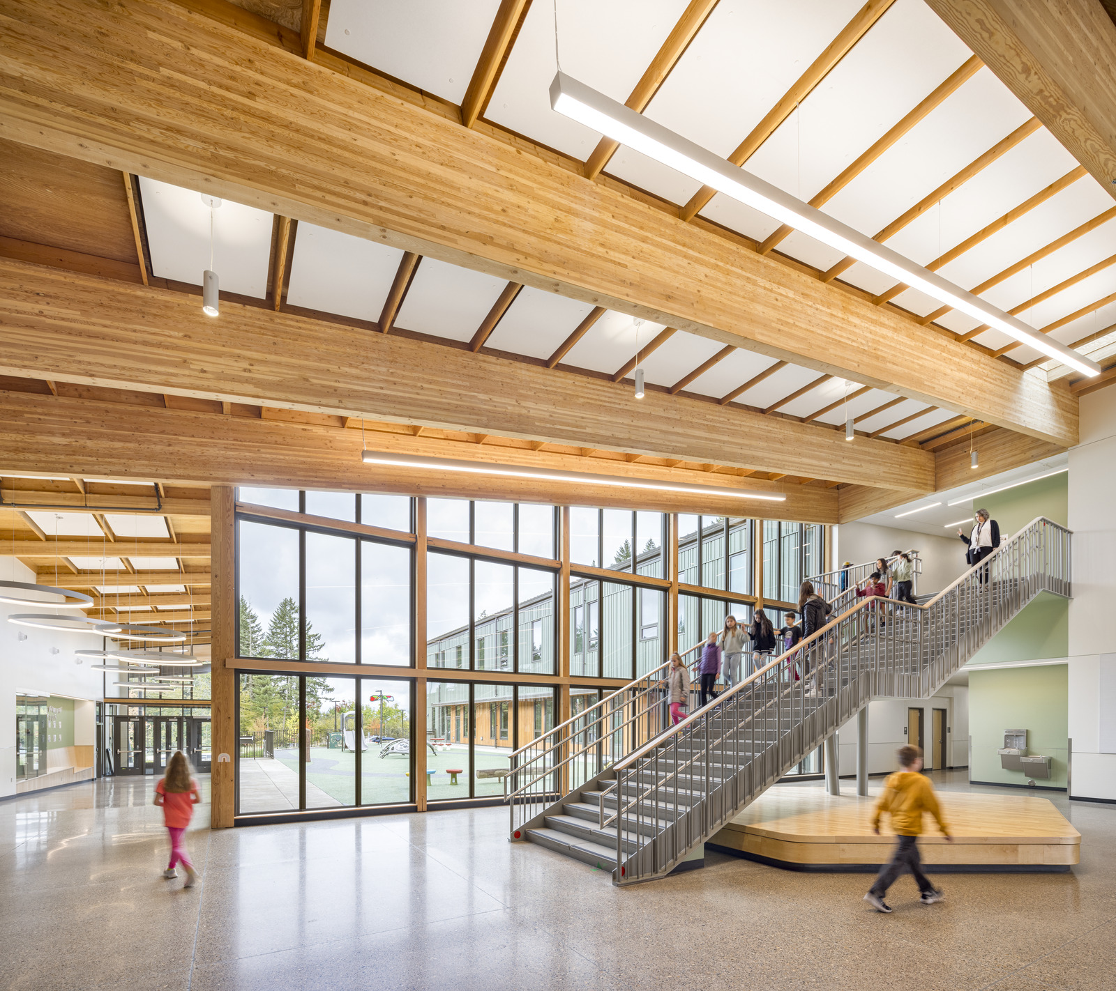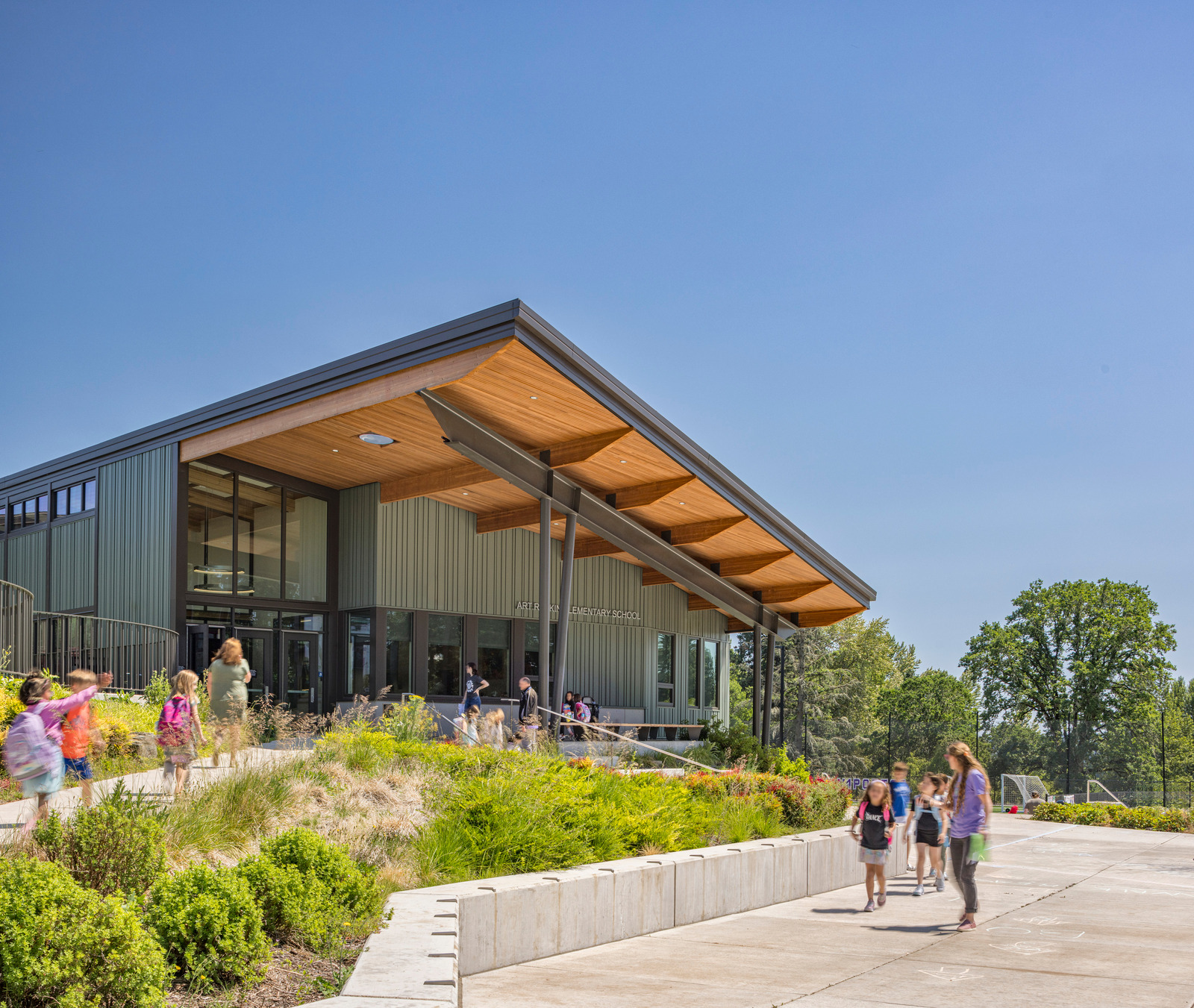 Nestled into an open hillside with a sweeping roof oriented to the southern sun, Art Rutkin Elementary School evokes the patterns and textures of the surrounding forest, clearly expressing its timber structural system and maximizing student connections to the natural world. Pursuing Net Zero energy, the school steps up the hill and is configured in two parallel bars linked by a generous commons.
