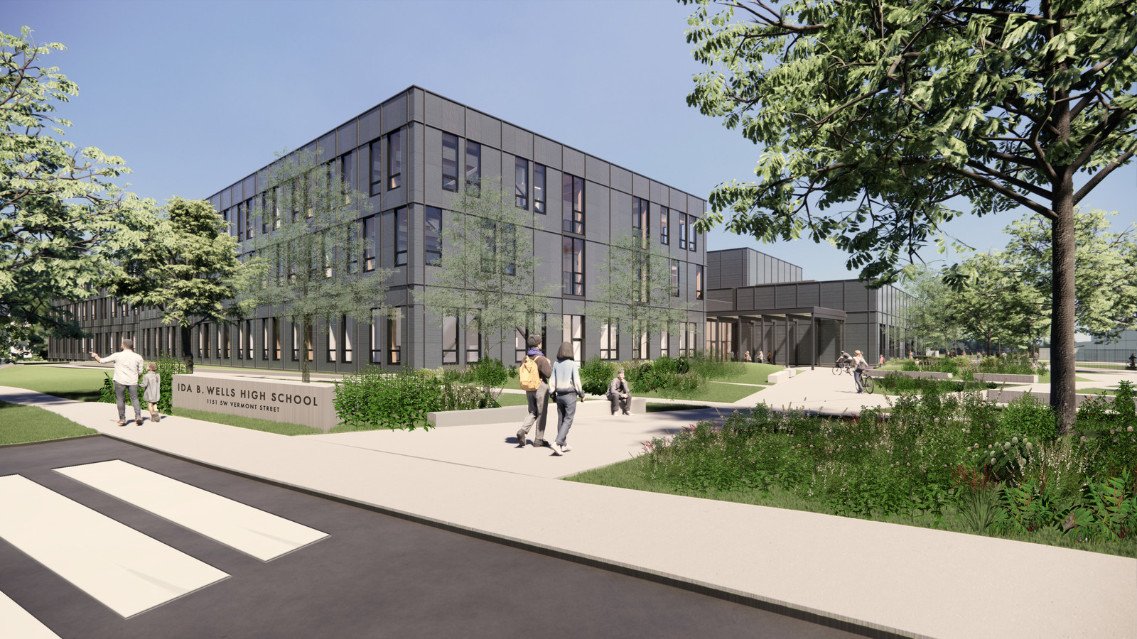 The modernization of Ida B. Wells-Barnett High School for Portland Public Schools is replacing the original 1956 school, formerly known as Wilson High School, in Southwest Portland. The new school’s values are being shaped by the community who passionately advocated for their school to be renamed for civil rights journalist Ida B. Wells, with the shared vision that it “will embody the legacy of its namesake, shining a light on her commitment to truth, transparency, and justice.”