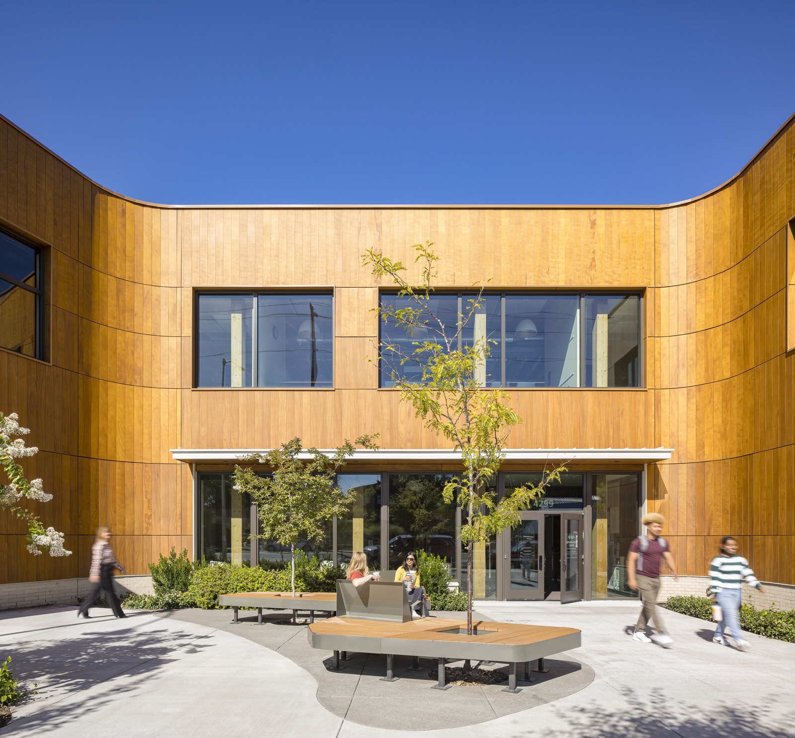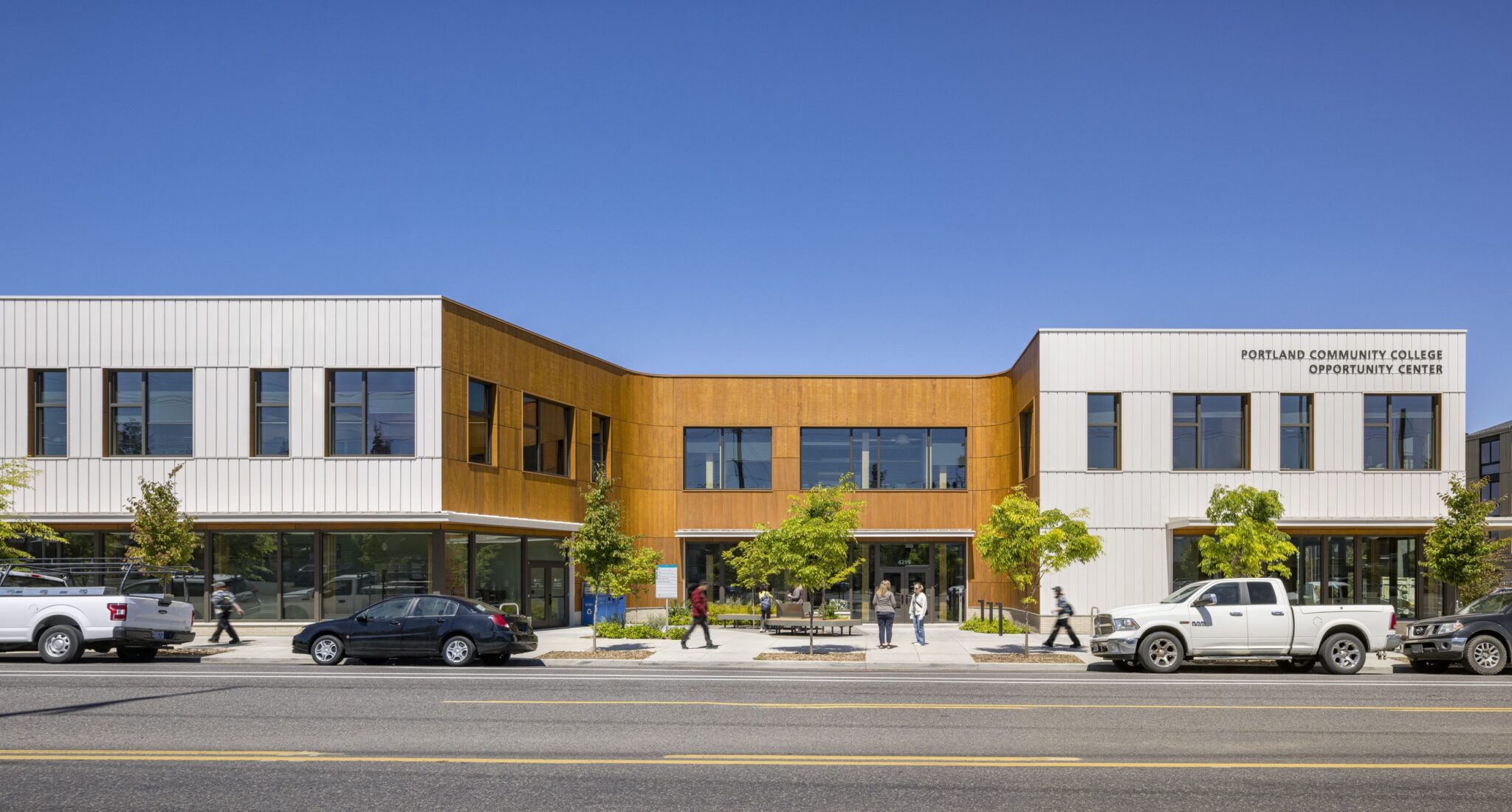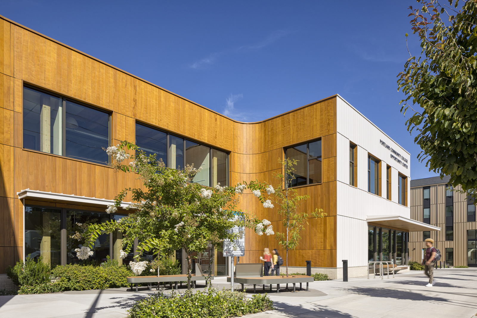 The Portland Opportunity Center at 42nd Avenue for Portland Community College is an anchor for the community in Northeast Portland’s racially diverse Cully neighborhood. Replacing PCC’s existing facility, the expanded Center creates opportunities for low-income families and residents, transforming lives through education and connections to family-wage jobs. Guided by trauma-informed design and Design Justice principles, Bora’s design seeks to cultivate a culture of collective care by creating restorative and humanizing spaces that connect to nature and celebrate cultural diversity. The College’s first project to pioneer a mass timber structure, the Center features classrooms, a career center, gathering space, and surrounding greenspace.
